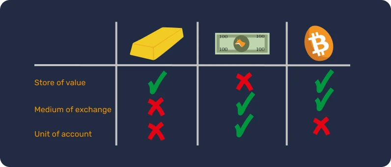 Zlato ideálně splňuje kritéria efektivního platidla: jeho přirozená vzácnost mu dodává hodnotu a jeho chemické vlastnosti zajišťují, že časem nepodléhá erozi. Díky těmto vlastnostem se zlato stalo skvělým skladem hodnoty, ale ne běžným platidlem, protože tato forma peněz není snadno dělitelná ani přenosná na velké vzdálenosti. V globalizovaném a digitálním světě zlato jen těžko drží krok a vyžaduje centrální subjekt, který by zajistil jeho dělitelnost a snadnou směnitelnost (tj. prostřednictvím ražených mincí).