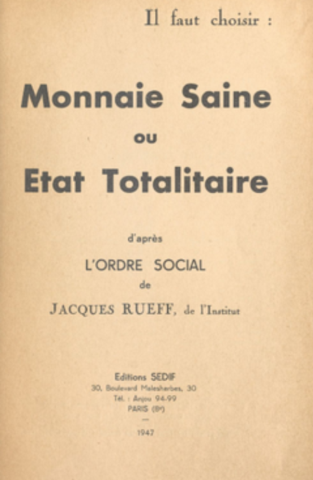 Tato kniha obsahuje klíčovou kapitolu s názvem: "Zdravé peníze nebo totalitní stát". V této kapitole rozvíjí dvě tvrzení. První: "Falešné peníze působí sociální nepořádek". Druhé tvrzení vyplývá z prvního: "Sociální nepořádek vede k sociálnímu otroctví". Falešné peníze jsou papírová měna, odpojená od jakékoli fyzické reality a manipulovaná vládnoucí mocí. Sociální nepořádek je inflace a konzumerismus, které z toho vyplývají. Sociální otroctví je závislost společnosti na státu, ztráta veškeré finanční, morální a politické autonomie.