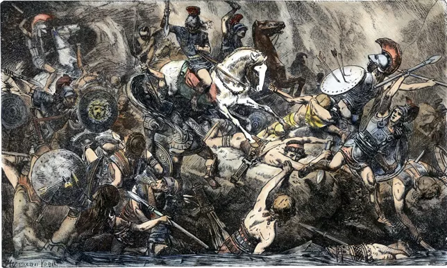 Gravur, die das Massaker der Athener an den Ufern des Assinaros darstellt.
