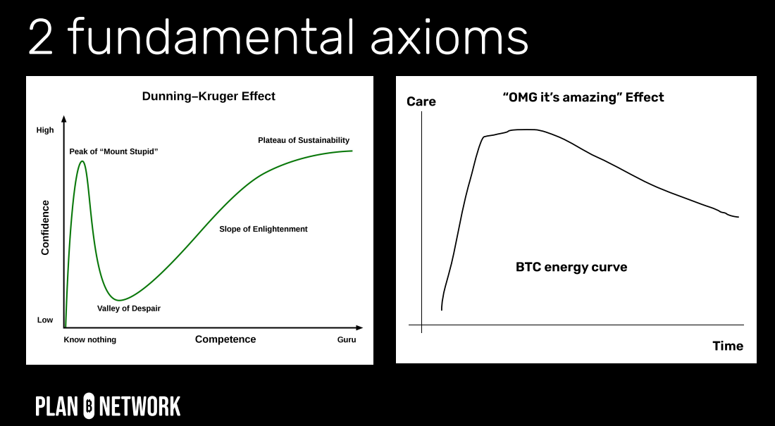 - Visual representation of two key concepts: the Dunning–Kruger Effect, showing confidence vs. competence, and the BTC energy curve, illustrating enthusiasm over time.