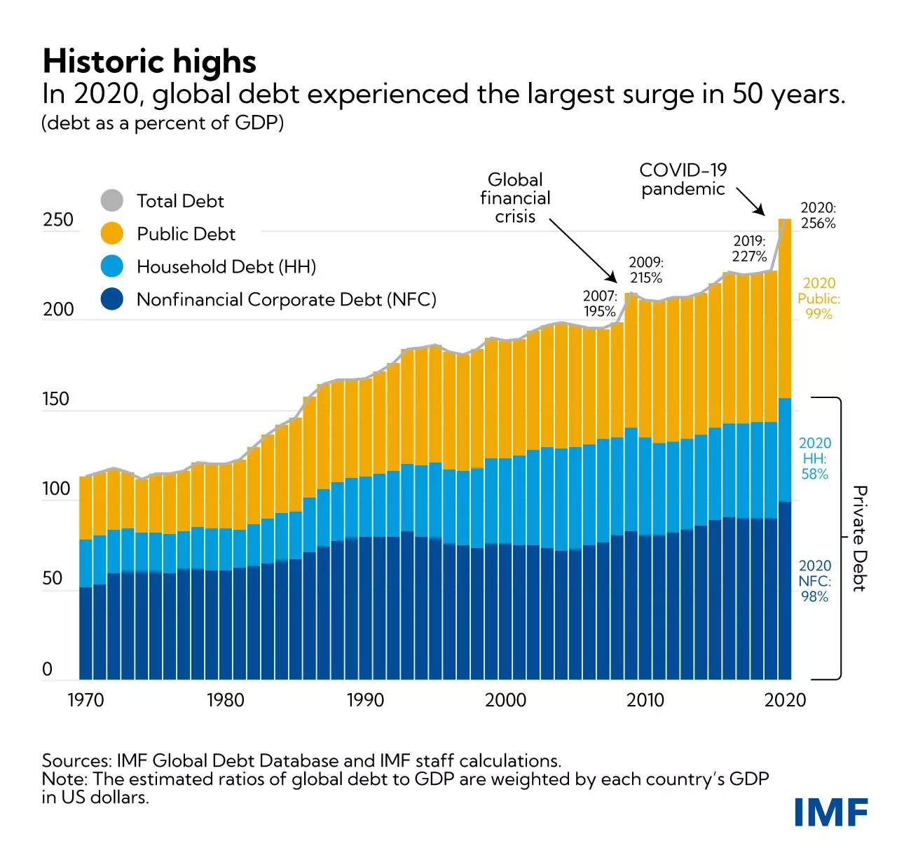 Figure 6: Public & Private Debt as % of GDP (World, weighted by GDP per country) / Source IMF