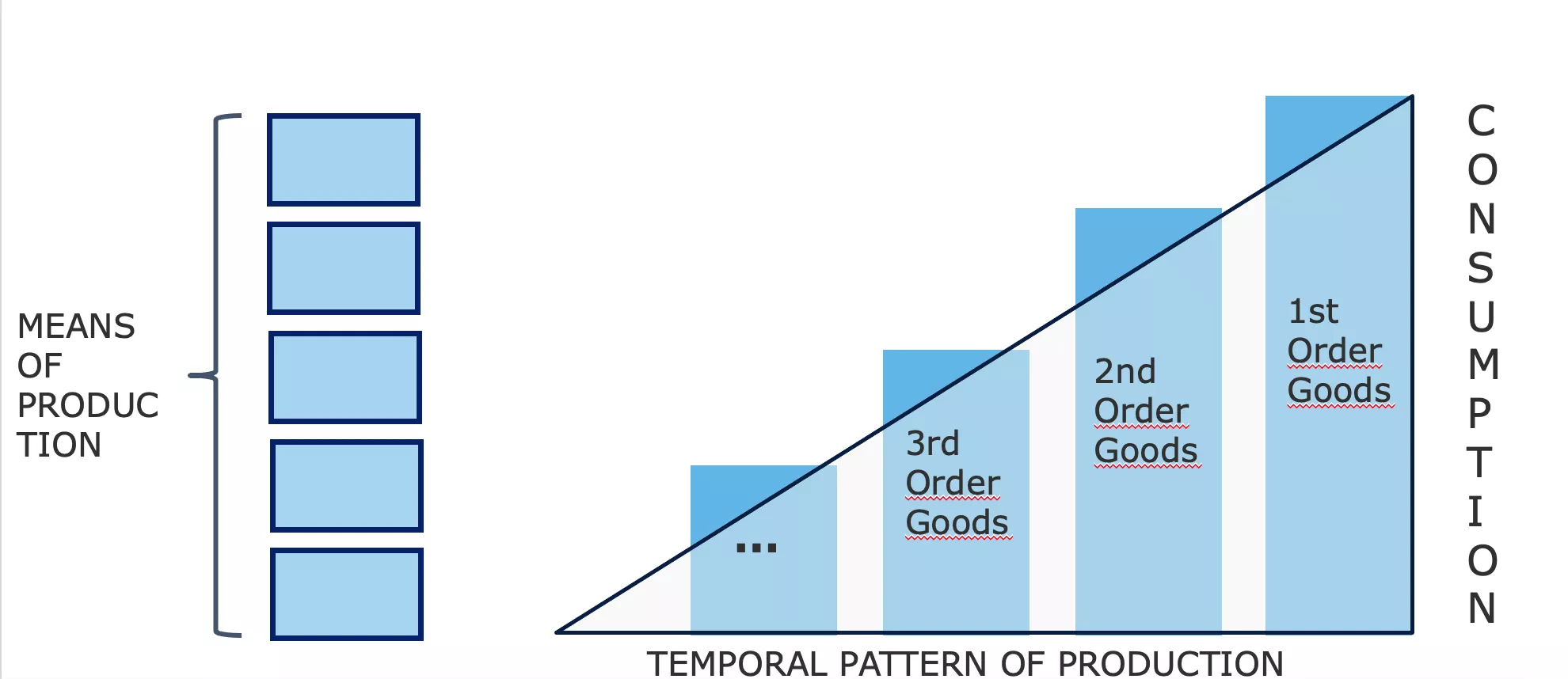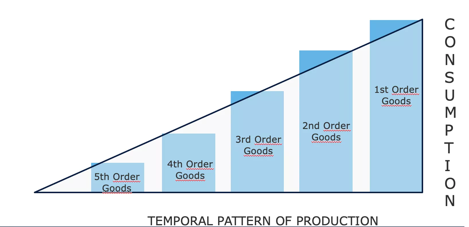 In the above diagram, initial resources pass through various stages of production, undergoing transformations that bring them closer to the state of final consumer goods (through interaction with original factors of production: time, land, labor). The height of the right side of the triangle schematically represents GDP since it denotes the sum of all consumer goods sold in a period. The gap between each bar corresponds to the value added (in monetary terms) generated by each stage of the process. This difference can also be seen as the income associated with each stage (revenues - costs).