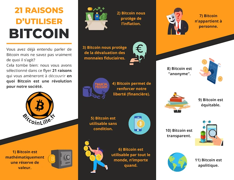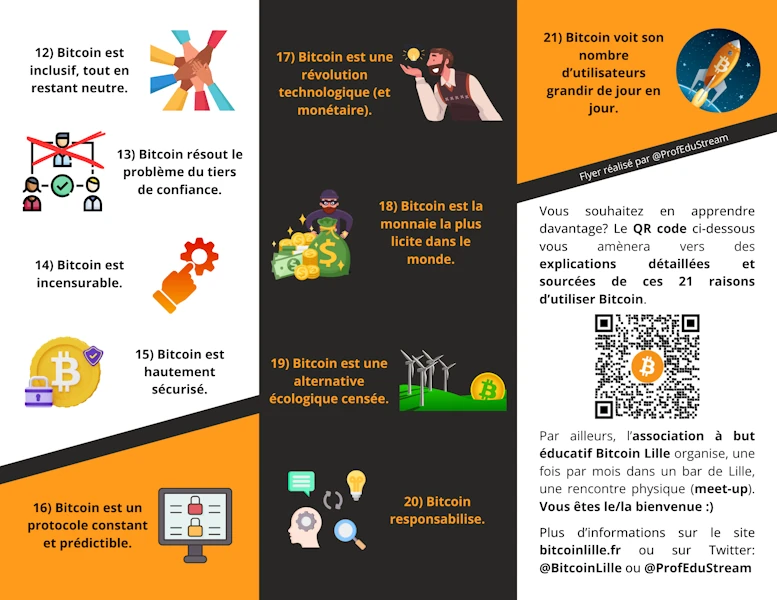 2/ une fois qu’il(elle) sera intéressé(e) ou vous demandera ce qu’est Bitcoin, vous pourrez lui expliquer succinctement et de manière vulgarisée. Par exemple, que Bitcoin est une monnaie, non contrôlée par les banques, sans intermédiaire de confiance, qu'il est incensurable, pas soumis à l'inflation et que les frais sont moindres qu'avec le système bancaire traditionnel. Vous pourrez alors lui donner un flyer, par exemple « 21 raisons d’utiliser Bitcoin » et/ou « 10 raisons d’accepter Bitcoin dans son commerce », puis lui donner votre contact ou celui de votre meet-up. Ainsi, lorsqu'il(elle) sera prêt(e) pour une démonstration "en direct", il(elle) pourra vous contacter.