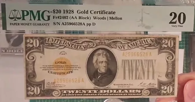 Em 1928, uma nota de 20 dólares dos Estados Unidos trazia a inscrição: "resgatável em ouro sob demanda". Isso significa que cada nota era literalmente conversível em ouro. Mais especificamente, uma nota de 20,67 dólares equivalia a uma onça de ouro.