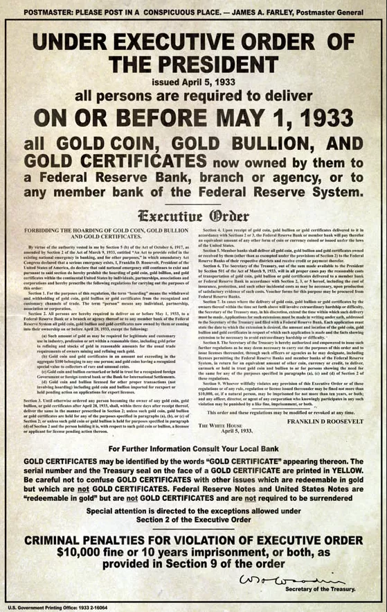 Em 1933, ocorreu uma grande perturbação com a emissão da Ordem Executiva 6102. Este decreto tornou ilegal a posse de ouro pelos cidadãos, seja em barras, moedas ou certificados.