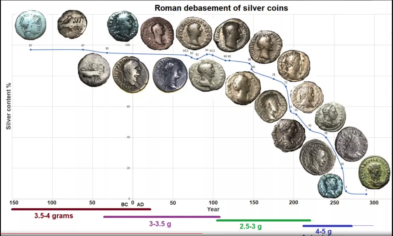 Redução do conteúdo metálico: Outro método consistia em reduzir a quantidade de metal precioso nas moedas baseadas em metais como prata ou ouro. Um exemplo marcante é o Império Romano, onde o denário, inicialmente composto quase inteiramente de prata, teve seu teor de prata drasticamente reduzido ao longo do tempo. Isso equivalia a uma forma de inflação, mas não necessariamente a uma hiperinflação.