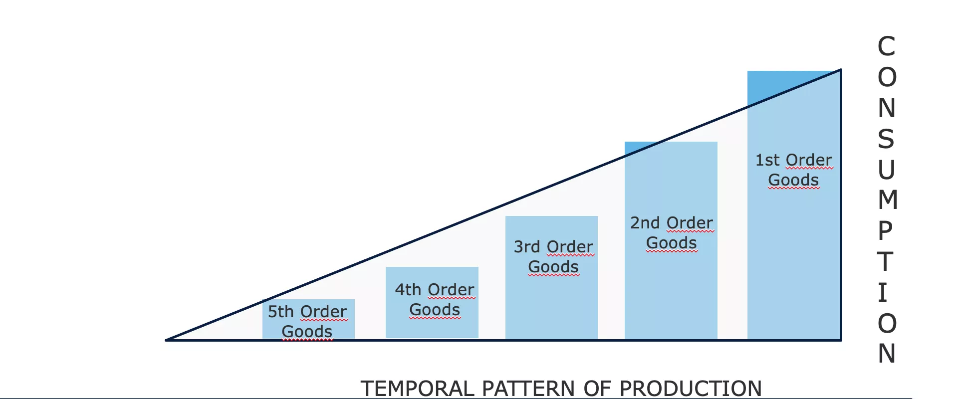 На приведенной выше диаграмме исходные ресурсы проходят через различные стадии производства, претерпевая преобразования, которые приближают их к состоянию конечных потребительских товаров (через взаимодействие с первичными факторами производства: время, земля, труд). Высота правой стороны треугольника схематически представляет ВВП, поскольку она обозначает сумму всех потребительских товаров, проданных за период. Разрыв между каждой полосой соответствует добавленной стоимости (в денежном выражении), созданной на каждом этапе процесса. Эту разницу также можно рассматривать как доход, связанный с каждым этапом (выручка - затраты).